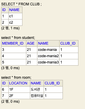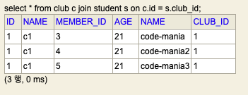 Student와 Club join 실행 후 테이블을 보면 3개의 행이 있는데,