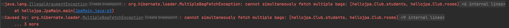 두 개 이상의 컬렉션을 동시에 페치조인하면 다음과 같은 에러가 발생한다.