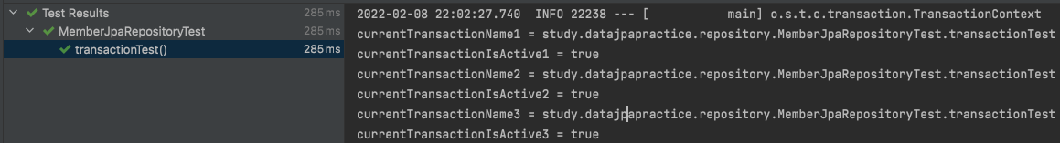 또한 transactionTest method에서 @Transactional을 제거하면