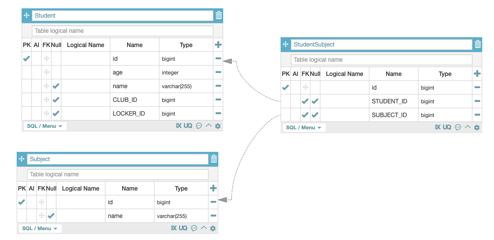 Student:StudentSubject = 1:N, StudentSubject:Student=N:1이 성립한다.