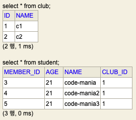 Student와 Club join 실행 후 테이블을 보면 3개의 행이 있는데,