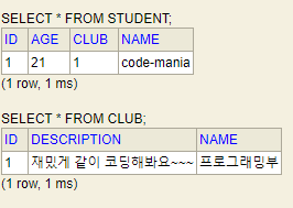 DB에서는 STUDENT 테이블에서 club이라는 컬럼을 FK로 사용해 CLUB테이블을 참조하고 있다.