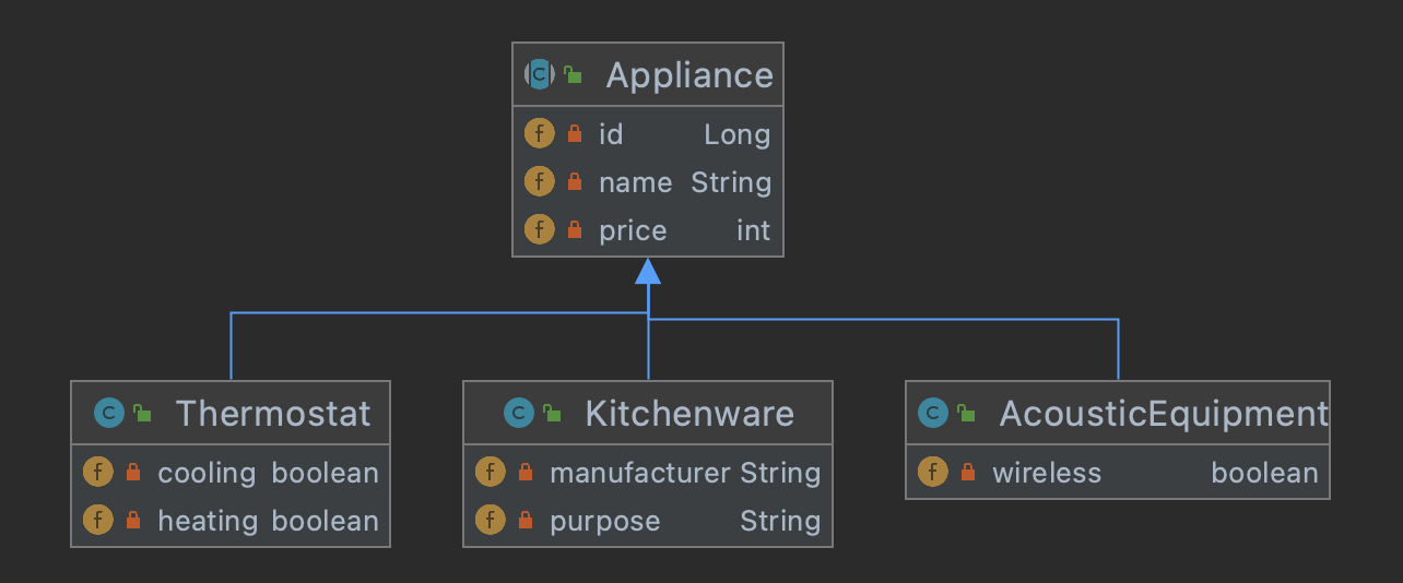 주의할 점은 Appliance(슈퍼타입의 엔티티)는 추상 클래스로 선언한다는 것이다!