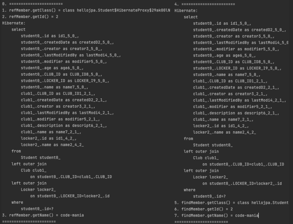 왼쪽은 getReference() 메서드를 통해 조회한 refMember의 출력물이고(0번 ~ 3번),