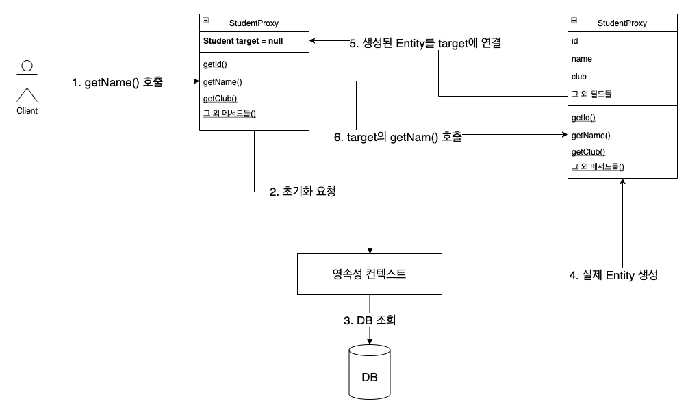 Proxy 객체를 초기화한다는 것은 Proxy 객체를 통해서 실제 엔티티에 접근 가능해지는 것을 의미한다.
