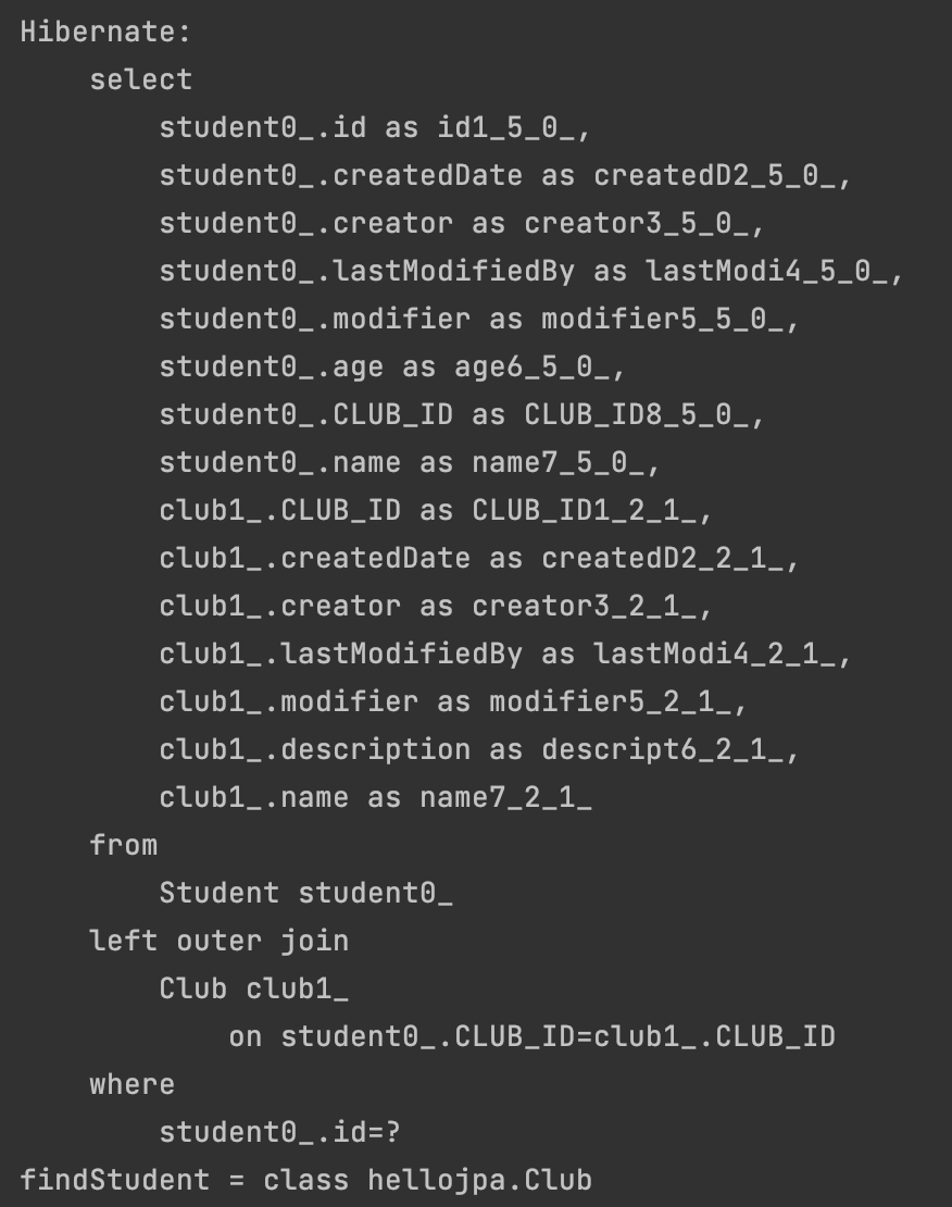 System.out.println("findStudent = " + findStudent.getClub().getClass());