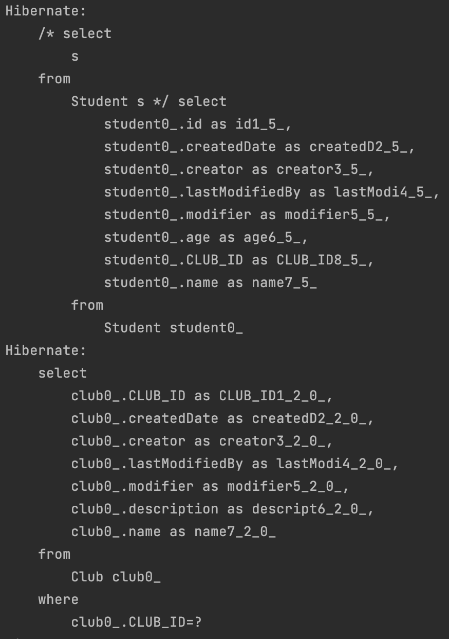 이 두 student 객체의 club을 채워주기 위해 select... from Club 쿼리가 두 번 나간 것이다.