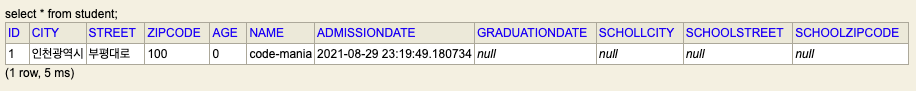 학생 엔티티는 이름, 나이, 입학날짜, 졸업날짜, 사는 곳의 도시, 도로명, 우편번호를 가진다고 하자!
